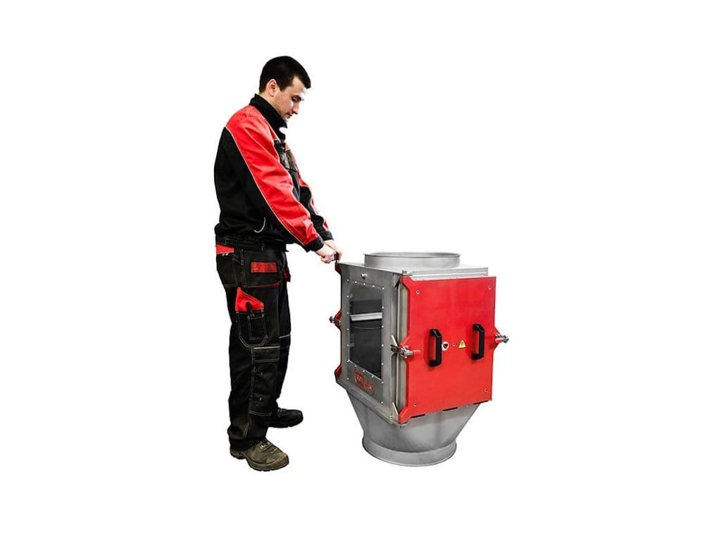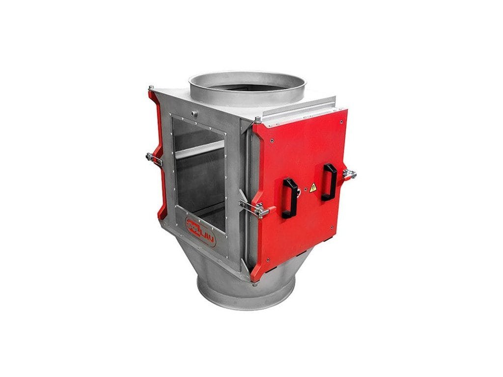 Magnetický doskový separátor ML sa používa na odchytenie kovových nečistôt z materiálov o horších sypných vlastnostiach (obilniny, múka, práškové materiály, piliny apod. By mohli zablokovať a upchať klasické magnetické roštové separátory). Telo separátora tvorí zváraná antikorová skriňa, ktorá sa po pripojení stáva integrálnou súčasťou potrubného systému. Tento separátor osvedčené štandardné konštrukcia má na vnútorných stranách dverí umiestnená neodymová magnetická jadra (chránená krycími nerezovými doskami), ktorá v kombinácií s Rozhrnovače strieškou zabezpečujú vysokú účinnosť magnetickej separácie. Pri čistení separátora sa krycie nerezové dosky odklopí od povrchu magnetov a zachytené feromagnetické kontaminanty samovoľne odpadnú. Pre zabezpečenie trvalej vizuálnej kontroly separačného procesu je zariadenie vybavené veľkými obojstrannými priezormi. |