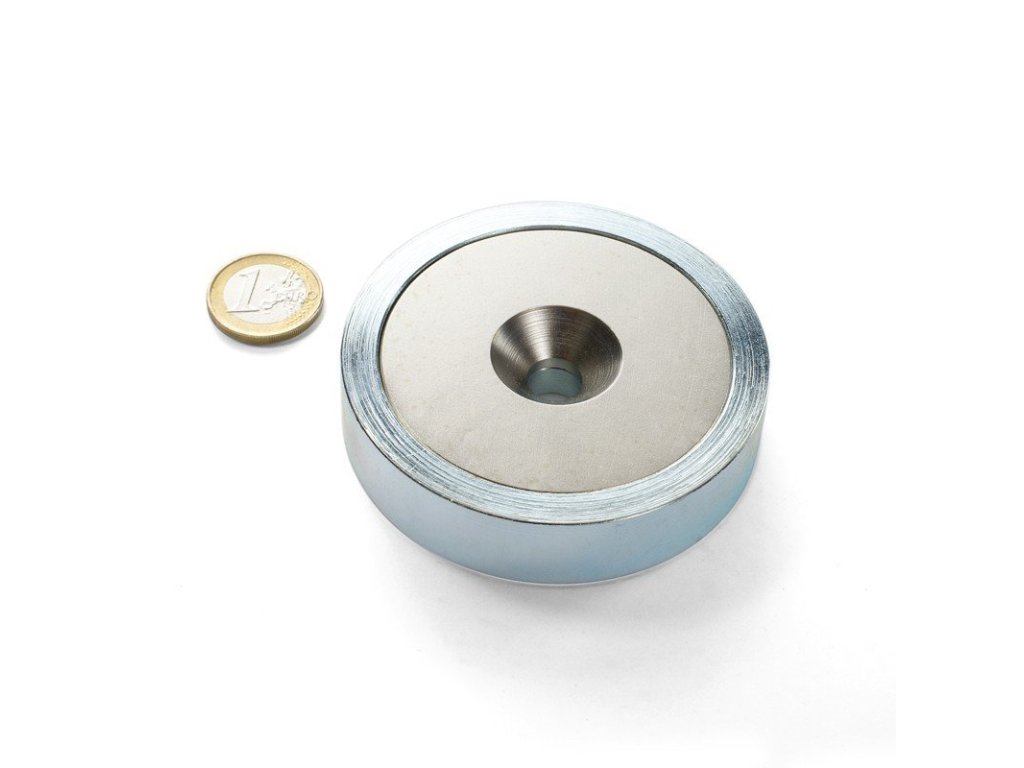 Neodymový poniklovaný magnet v oceľovom pozinkovanom puzdre s priehlbinou na skrutku M10.